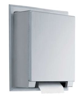 Intuitive, patron-friendly light directs users to towel activation zone. Satin-finish stainless steel. Door has tumbler lock and piano-hinge. Seamless satin-finish stainless steel beveled flange designed for semi-recessed installation in wall opening 16’’ W, 18 3/8’’ H, 4’’ D (405 x 480 x 100mm). Extends 5 1/4’’ (130mm) from wall. Battery requirements: 4 Alkaline ’’D’’ Cells (not included).